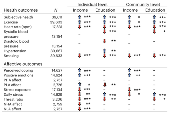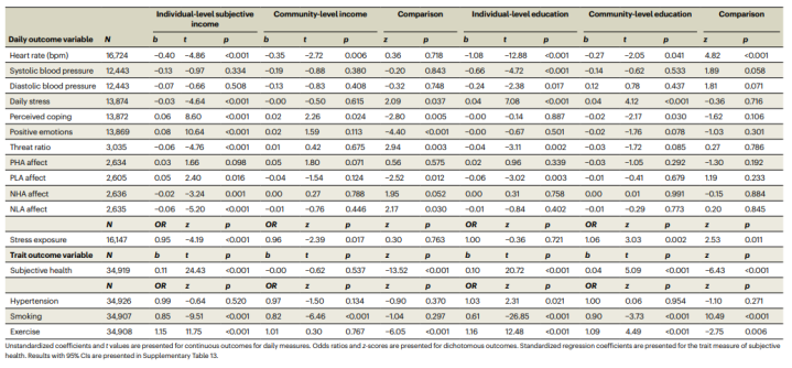 除了个体层面的变量,研究还整合了社区层次的社会经济数据(来自美国人口普查),系统分析个体与社区两层水平中主观收入和教育水平对日常健康(心率、血压、吸烟、运动)与心理幸福感(情绪、压力应对、压力暴露)的独立与交互作用。主要研究发现如下: