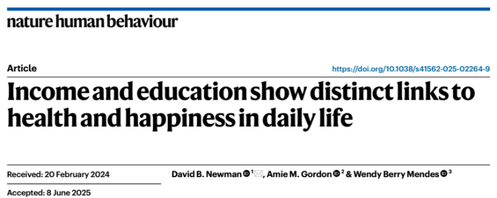 NewmanDB,GordonAM,MendesWB.Incomeandeducationshowdistinctlinkstohealthandhappinessindailylife.NatHumBehav.2025Aug8.doi:10.1038/s41562-025-02264-9.Epubaheadofprint.PMID:40781569.
