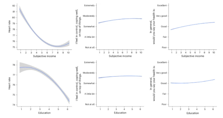 教育方面:较高教育水平同样与更好的生理指标相关(如更低心率、血压、吸烟率),但也伴随更高的高血压报告率(研究指出该结果需结合BMI等因素谨慎解读)以及更高的日常压力水平。