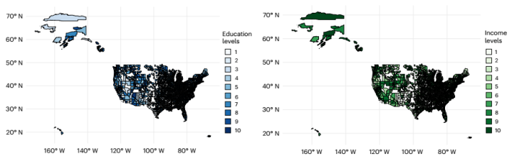 △样本中参与者所在县的可视描述。较深的蓝色和绿色分别对应较高的教育水平和收入水平